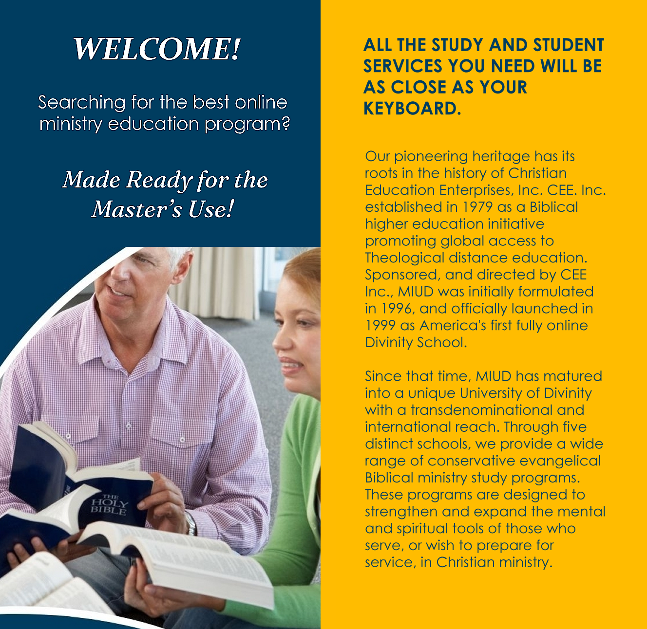 The current challenges of Christian ministry call for up-to-date credentials earned from an institution that produces competent graduates through Biblically, academically, and financially credible programs. For more than a quarter century, the core goal of MIUD has been to come alongside grassroots Christian leaders to provide a simplified path to increased Biblical knowledge so that by adding to the stores of what they already know, they will be refreshed in their hearts and minds as they lead others in the paths of righteousness for His name's sake. If God is urging you to add to or refresh your Biblical knowledge, we invite you to scroll through our programs as you prayerfully seek His direction.
