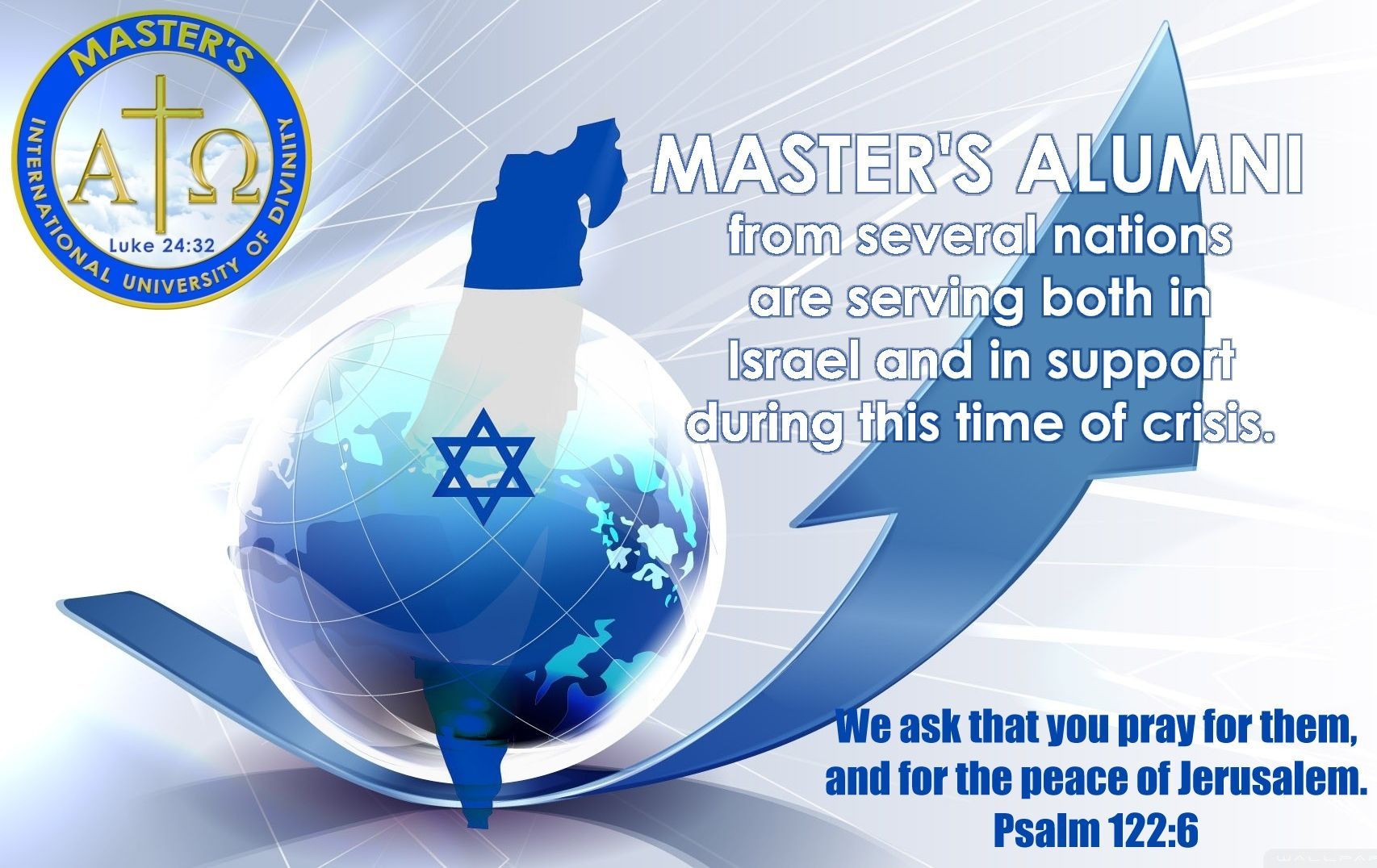 Pray for the Peace of Jerusalem, the strength and safety of many MIUD students and graduates currently serving in Israel through Bridges for Peace, and supporting Israel from abroad. Nations from which our alumni are serving include The United States, Canada, The United Kingdom, and South Africa.